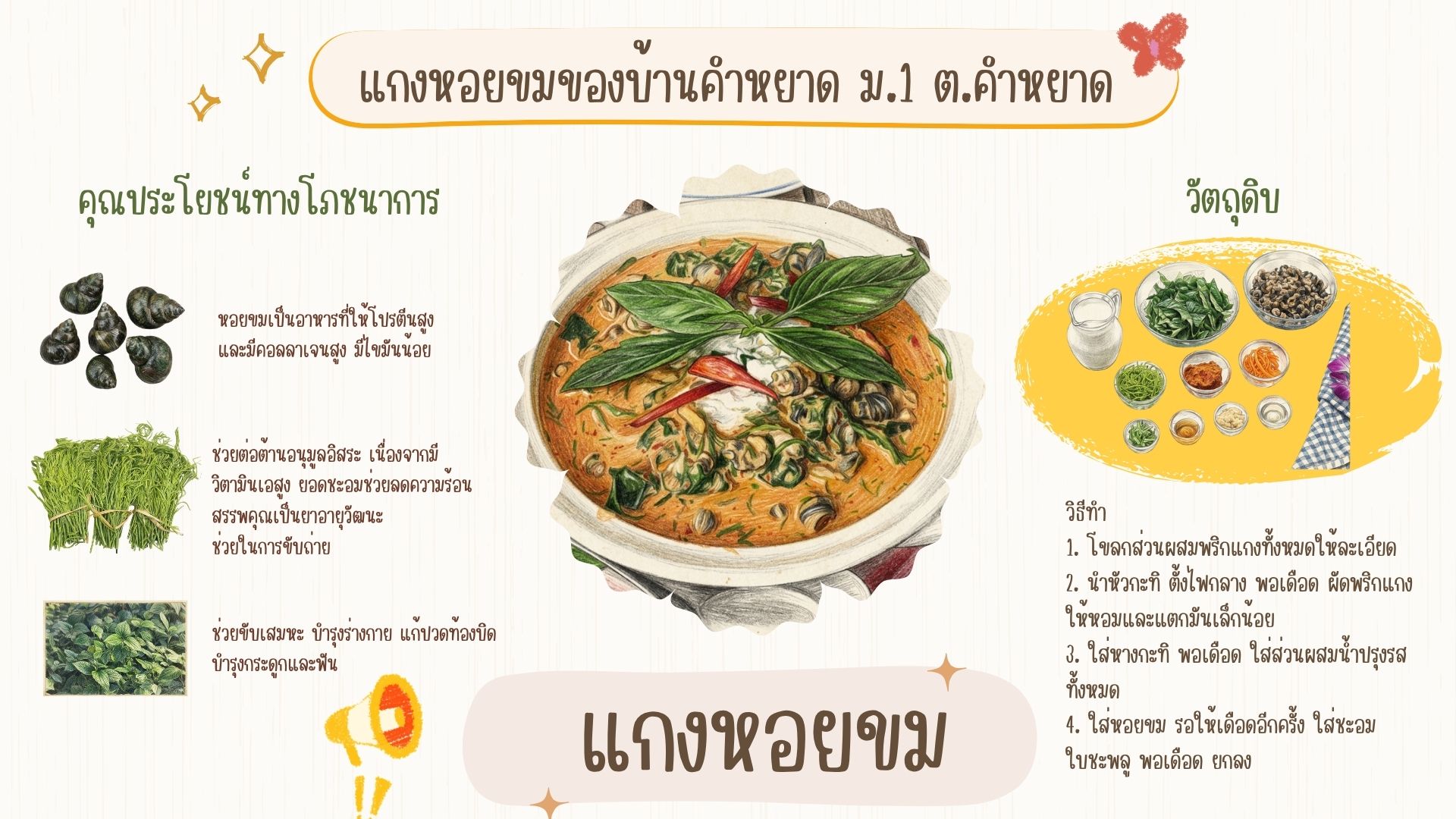 แกงหอยขมของบ้านคำหยาด หมู่ที่ 1 ต.คำหยาด มีรสชาติเค็มและหวานจากผัก น้ำแกงมีลักษณะแตกมันเล็กน้อย สีสวยเป็นเมนูพื้นบ้านที่อุดมด้วยประโยชน์ทางโภชนาการสูง หอยขม มีสรรพคุณให้โปรตีนและมีคอลลาเจนสูง ชะอม ช่วยลดความร้อนในร่างกาย ช่วยในการขับถ่าย ใบชะพลู ช่วยขับเสมหะ บำรุงร่างกาย แก้ปวดท้อง